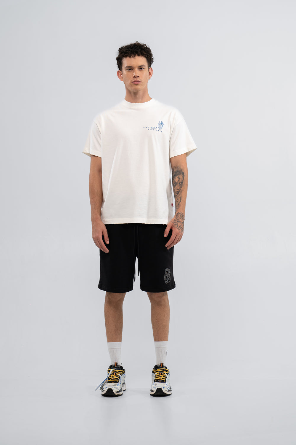 Black short de silueta relajada y bota recta. Pretina resortada con cordón ajustable y punteras contramarcadas. Logo bordado en la pierna izquierda y bolsillo de parche en la parte posterior.