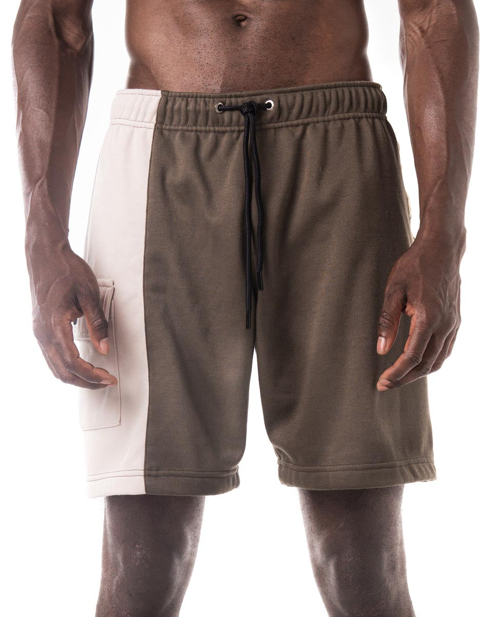 Shorts bicolor verde y nude. Cintura con cordón negro para fácil ajuste. Detalles en costado izquierdo y bolsillo tipo cargo en costado derecho.