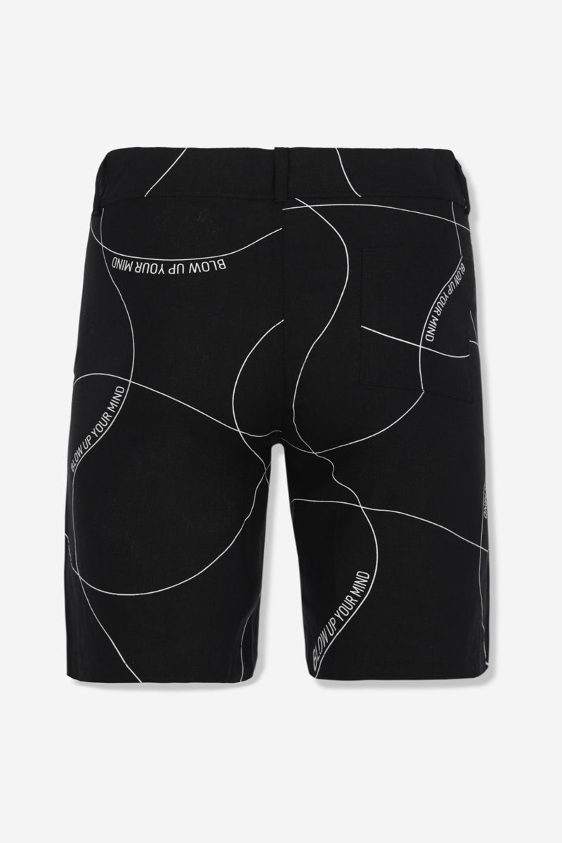 Shorts en lino color negro. Presenta un diseño sencillo de líneas y textos curveados en color blanco. Su ajuste en la cintura es con cremallera y botón.