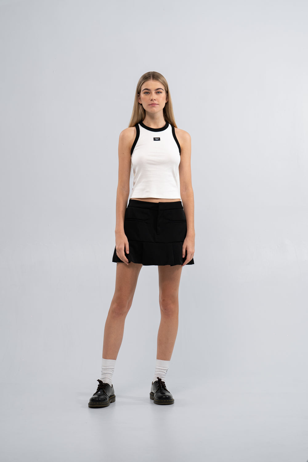 Tank top de mujer con cuello redondo y manga sisa. Color ivory y largo a la cintura. Aplique de Blow Up en el frente y detalles en contraste en cuello y sisa.