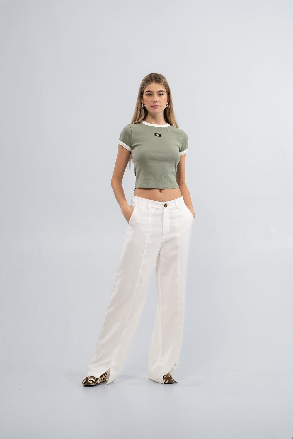 Camiseta cropped de mujer en color verde. Slim fit, manga corta y largo a la cintura. Cuello y puños en contraste. Aplique de Blow Up en el frente y granada estampada en la espalda.