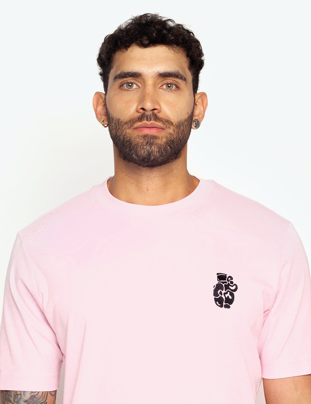 Camiseta rosa de manga corta. Granada color negro en la parte frontal izquierda.