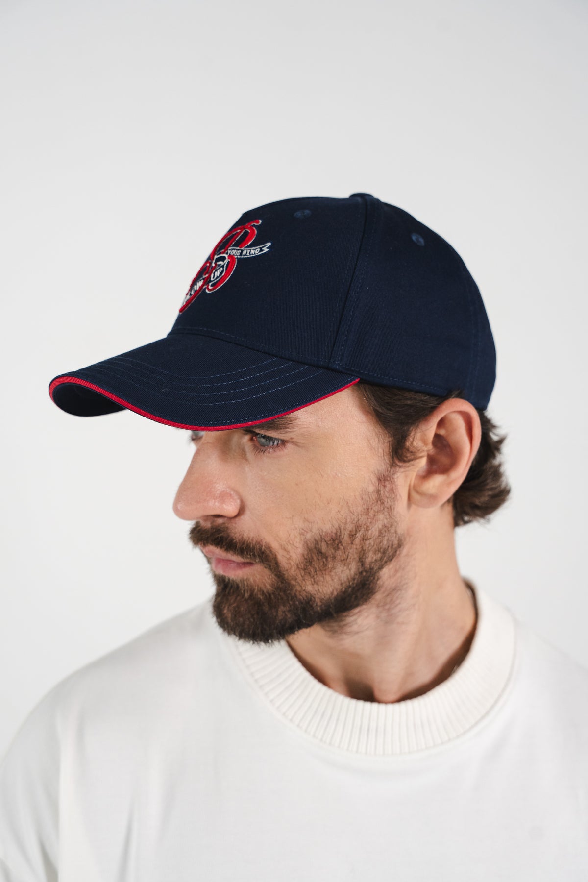 Gorra en tono azul profundo con estructura firme y paneles reforzados.