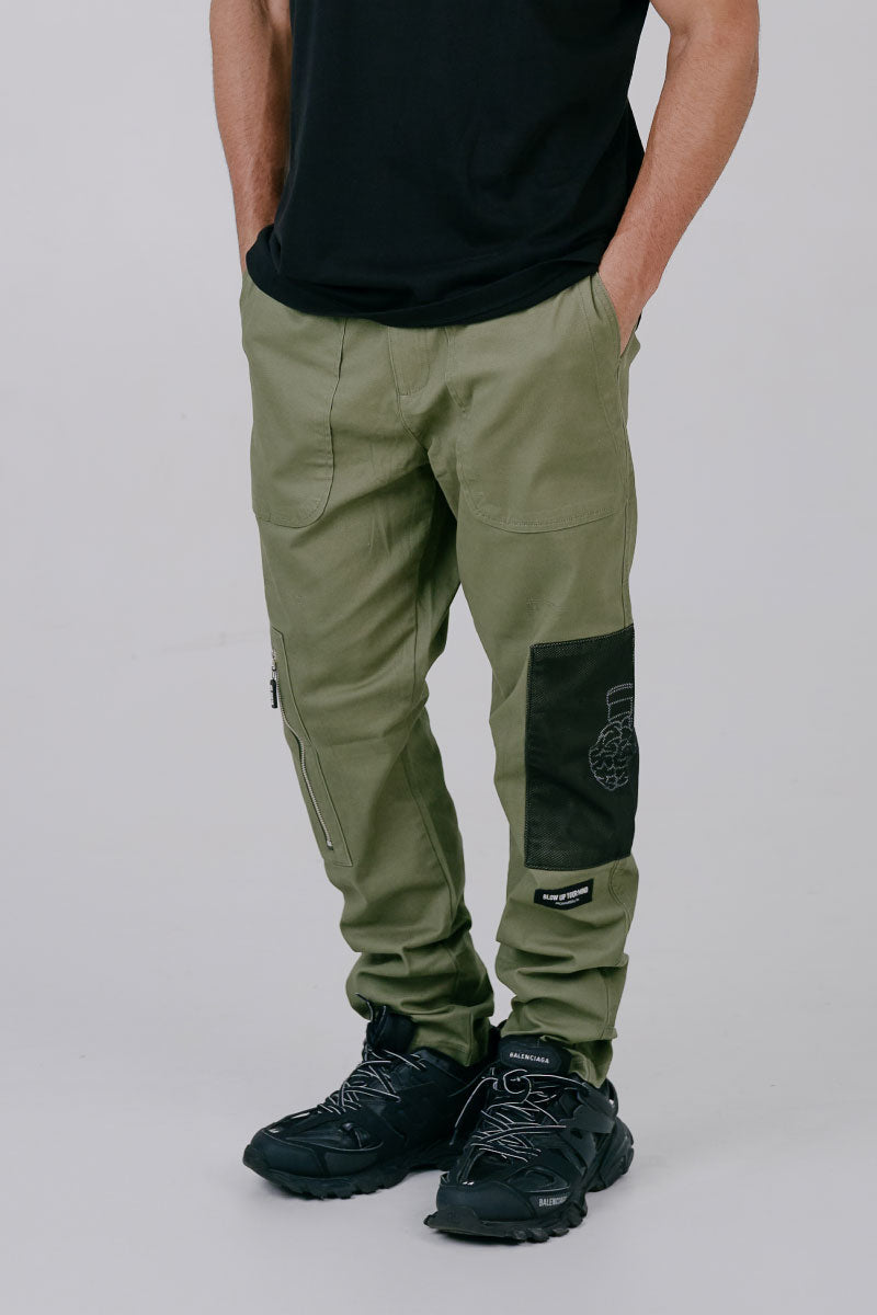 Pantalón cargo verde. Cintura con pasadores y botón. Dos bolsillos en la parte superior delantera. Bolsillo con cierre en la pierna derecha. En la pierna izquierda malla con granada en color blanco y texto BLOW UP.