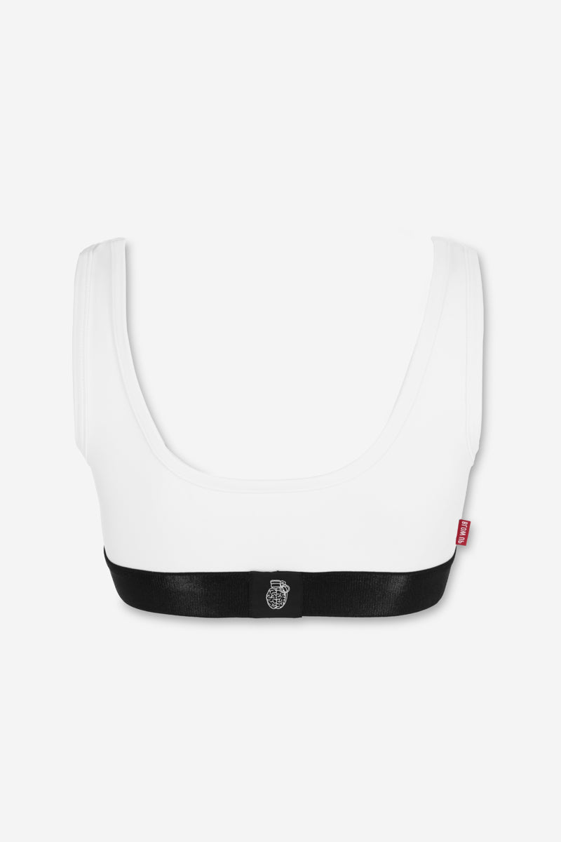 Top blanco. Elástico con texto BLOW UP YOUR MIND en color blanco. Marquilla en color rojo al costado derecho.